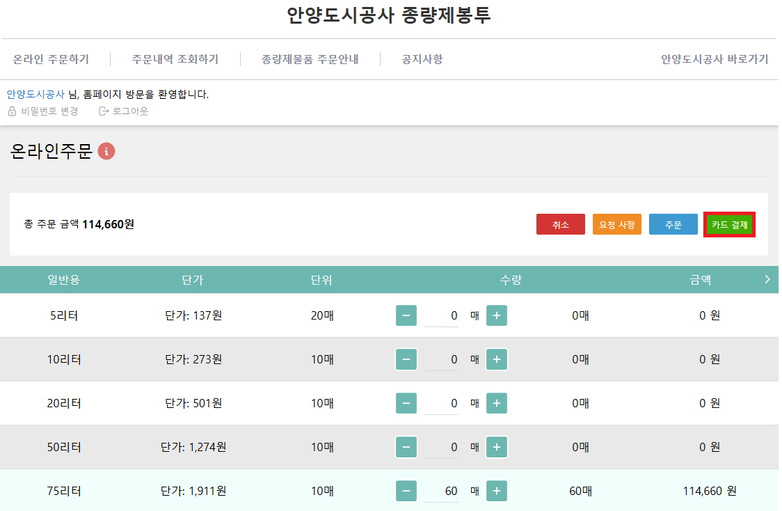 1. 종량제물품 주문 메뉴 로그인(아이디와 비밀번호는 주문 내역 알림톡에 기재)
